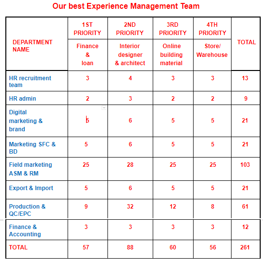 The management of our group company is well trained ,experienced and honest . The employees of our group company are very hard working , ambitious ,motivated, cooperative and has strong work ethic. There are different departments for different areas of work and each department has its own specialized and experienced team . the projects are down to earth and cost effective.